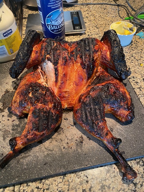 The finished product was rescued in the nick of time. I do a lot of chicken and cut them in half. A five-pounder is done in 32 minutes (16 X 2). Extrapolating, I went for 24 on each side and came close to turning it into a mummy. The beauty of spatchcocking, if there is one at all, is everything gets done at the same time or close enough that you don’t find that questionable pink-colored meat near the orthopedic intersection of the thigh/drumstick (patella?).