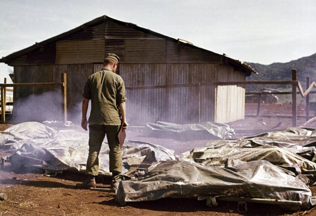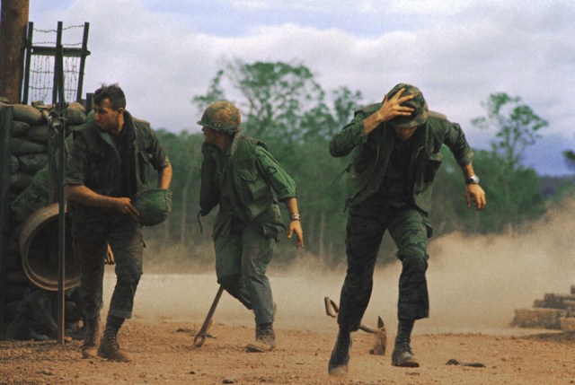 U.S. Special Forces troops stationed at BuPrang Special Forces camp 110 miles northeast of Saigon, run for cover as dust settles from an exploded enemy mortar shell that just landed immediately behind them in 1969. (AP Photo)