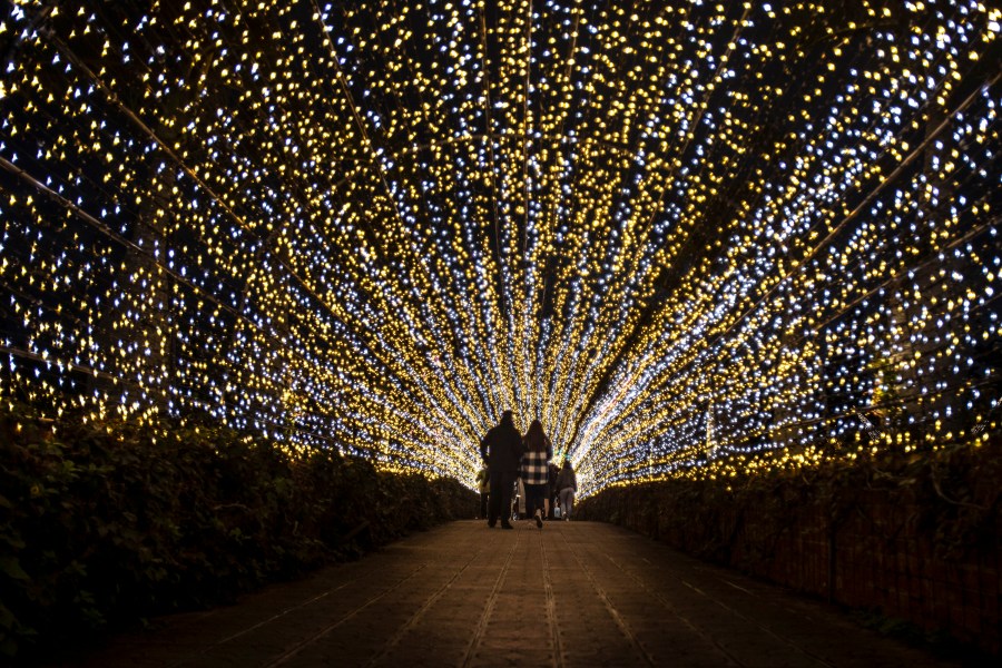 Guests enjoy a lit up walkway at the Southeast Botanical Gardens, Chibana, Okinawa, Japan, during a Marine Corps Community Services (MCCS) holiday trip, Dec. 20, 2020. MCCS hosted the holiday trip to celebrate the upcoming holiday season and offer Marines, Sailors and their families an opportunity to get off base and enjoy the seasonal lights displayed at the Southeast Botanical Gardens. (U.S. Marine Corps photo by Sgt. Micha Pierce)