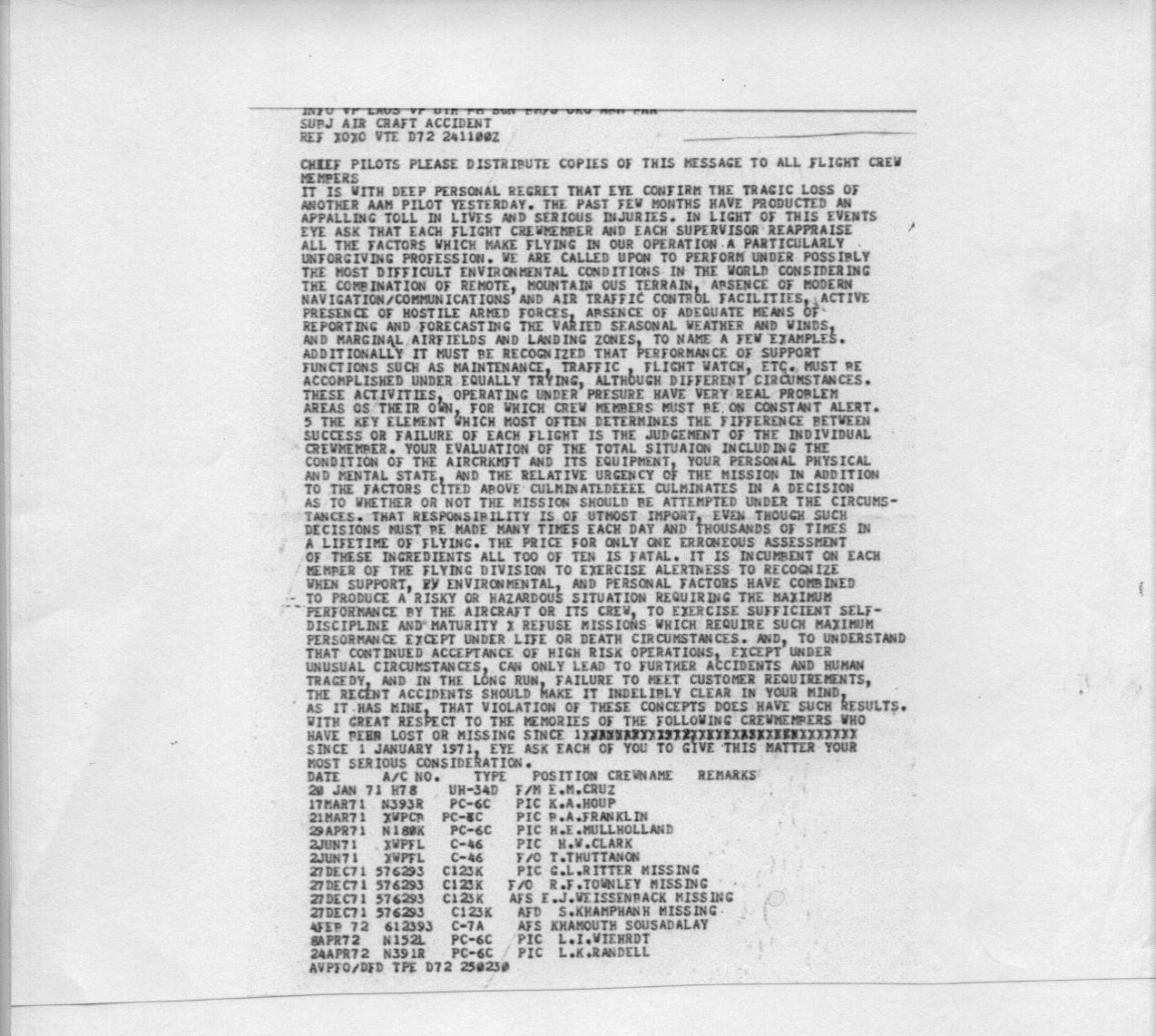 Air America, or simply AirAm, was composed of a civilian cadre who, more often than not, were former military Veterans from WWII or civilian chopper pilots who wanted more excitement than cruising over LA at 1800 Hrs reporting the traffic jams on KXLY. It was composed of fixed wing pilots who couldn’t find a berth at a respectable airline due to their personality quirks or prior sketchy FAA records. The “cargo delivery specialists” (kickers) were, for the most part, smokejumpers who fought forest fires. One thing they all had in common was that je ne sais quoi of adventurers variously described as the Terry and the Pirates™ gene. I don’t think anyone consciously enjoyed seeing green tracers corkscrewing up to meet you as you came left on final at a remote airstrip on top of a karst. But what the hey? Some seek the thrill of cheating death.