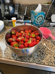 My strawberries are officially back. I’m inherently lazy as all know so I used to just aim the grass chute over the side of the embankment and blow it there when I mowed. Eventually, the grass took over the strawberry patch below, and the plants ceased production. I had our tree and lawn service nuke it with Agent Orange and left a narrow swath at the top which we weeded out. After five years, the fruits have returned. Imagine. It all began when a bird pooped out the first seeds in 2004. Hell, if I plant a Filbert tree I could have both fruits and nuts in my front yard and pretend I lived in California… Not.