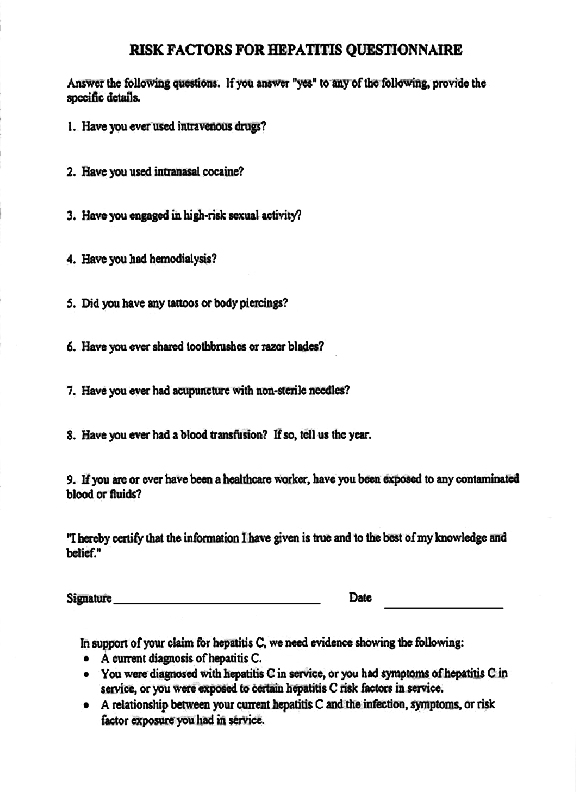 This form is stupid. It’s also a “trick and trap” form. Can they be more specific? Ex. #3. High-risk sex. Do you mean men having sex with men? Which acts have you identified as casual for HCV? Do you mean having unprotected sex with partner trying to conceive a child? # 9. So only health care workers can answer this question? As if healthcare workers have magical ESP-like powers to detect contaminated blood in emergency situations! What about the soldier giving first aid to another injured and bloody soldier in the field? That doesn’t qualify?